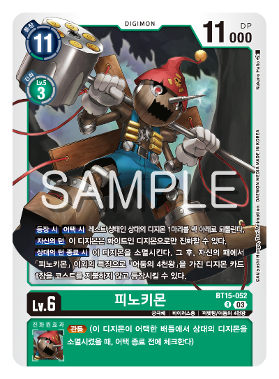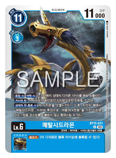 등장 코스트 15 / 진화 코스트 청색 LV.6에서 6 또는 녹색 LV.6에서 6 또는 흑색 LV.6에서 6 또는 자색 LV.6에서 6