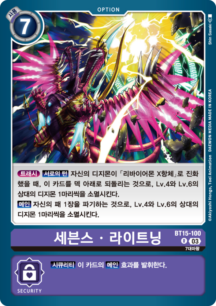 【진화 시】 상대의 디지몬과 테이머의 합계가 자신의 디지몬과 테이머의 합계 이상이라면 상대의 테이머 1체를 소멸 시킨다. 그 후, LV.3과 LV.5와 LV.7의 상대의 디지몬 1체씩을 소멸 시킨다.