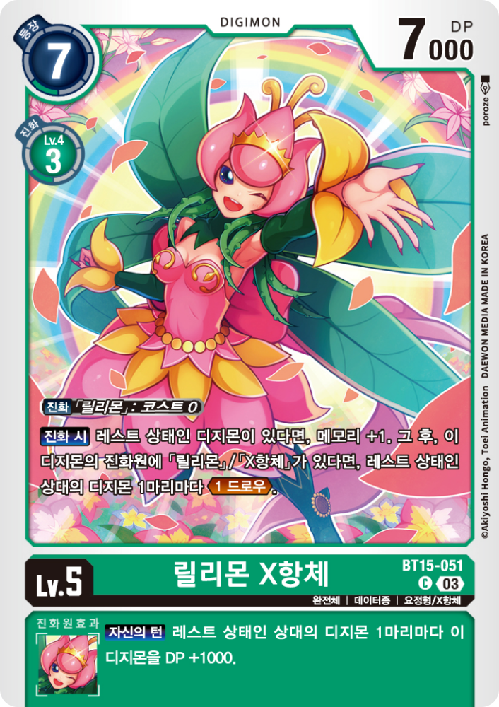 【진화 시】 레스트 상태의 디지몬이 있다면 메모리 + 1. 이 디지몬의 진화원에 「릴리몬」/「X항체」가 있다면 레스트 상태의 상대 디지몬 1체당 【1 드로우】.