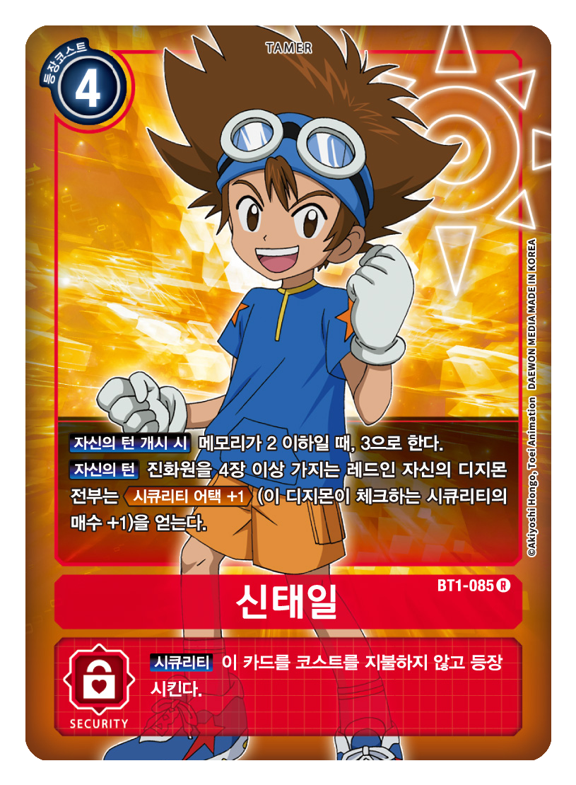 【자신의 턴】 진화원을 4장 이상 가진 적색의 자신의 디지몬 전체는 【시큐리티 어택 + 1】 (이 디지몬이 체크하는 시큐리티의 장수 + 1) 을 얻는다.