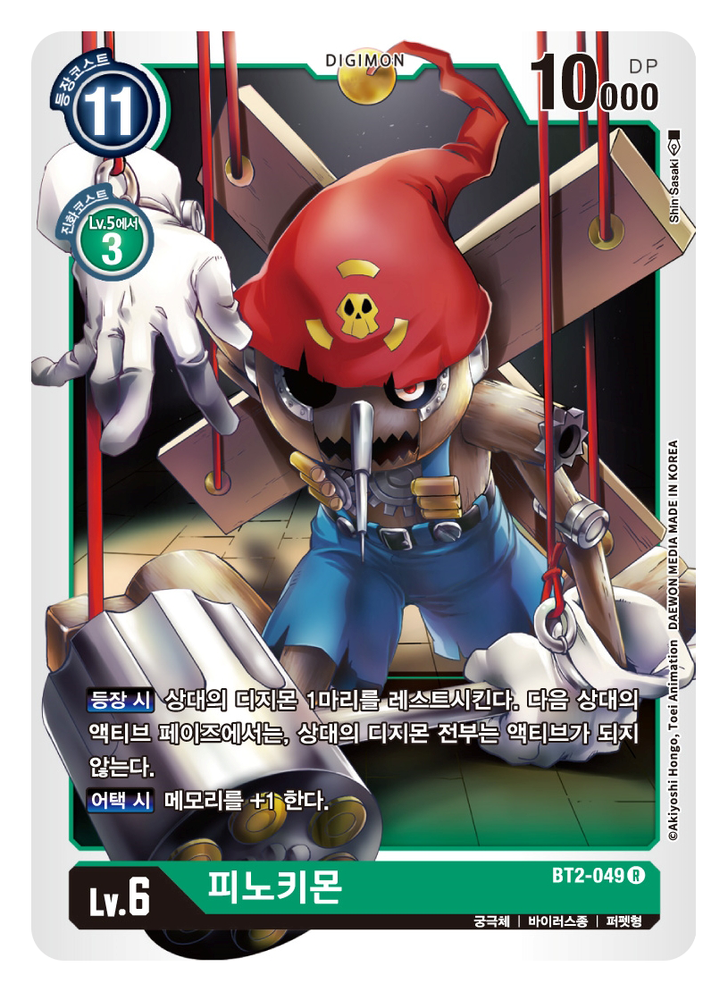 진화원 효과 :【자신의 턴】이 디지몬이 배틀에서 LV.6이상의 상대 디지몬만을 소멸시켰을 때, 이 디지몬을 액티브한다.