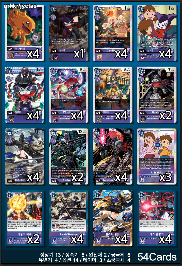 흠이 있다면 이 덱에서 정작 쓸만한 3레벨, 4레벨 디지몬이 없다는 점인데, 그럼에도 게임 후반 서로 자원이 말라가는 상황에서 공짜로 등장하는 디지몬이 가뭄의 단비 같을 때가 있다.
