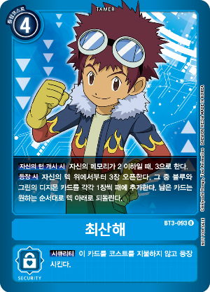 【등장 시】자신의 덱 위에서 3장을 오픈한다. 그 중의 청색과 녹색의 디지몬 카드 1장씩을 패에 추가한다.