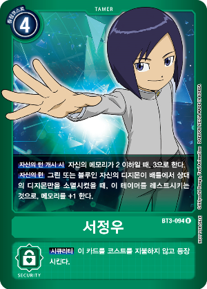 【자신의 턴】자신의 녹색이나 청색 디지몬이 배틀로 상대 디지몬만을 소멸시켰을 때, 이 테이머를 레스트시키는 것으로 메모리를 + 1 한다.