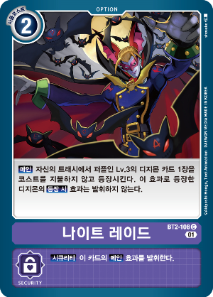 진화원 효과 :【자신의 턴】자색의 자신의 디지몬이 있는 동안 이 디지몬은【시큐리티 어택 + 1】(이 디지몬이 체크하는 시큐리티의 장수 + 1) 를 얻는다.