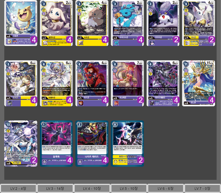 그 중의 황색과 자색의 디지몬 카드 1장씩을 패에 추가한다. 남은 카드는 좋아하는 순서대로 덱의 아래에 되돌린다.