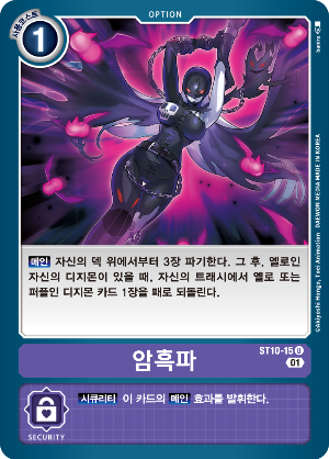 【메인】자신의 덱 위에서 3장을 파기한다. 그 후, 황색의 자신의 디지몬이 있을 때, 자신의 트래쉬에서 황색이나 자색의 디지몬 카드 1장을 패로 되돌린다.